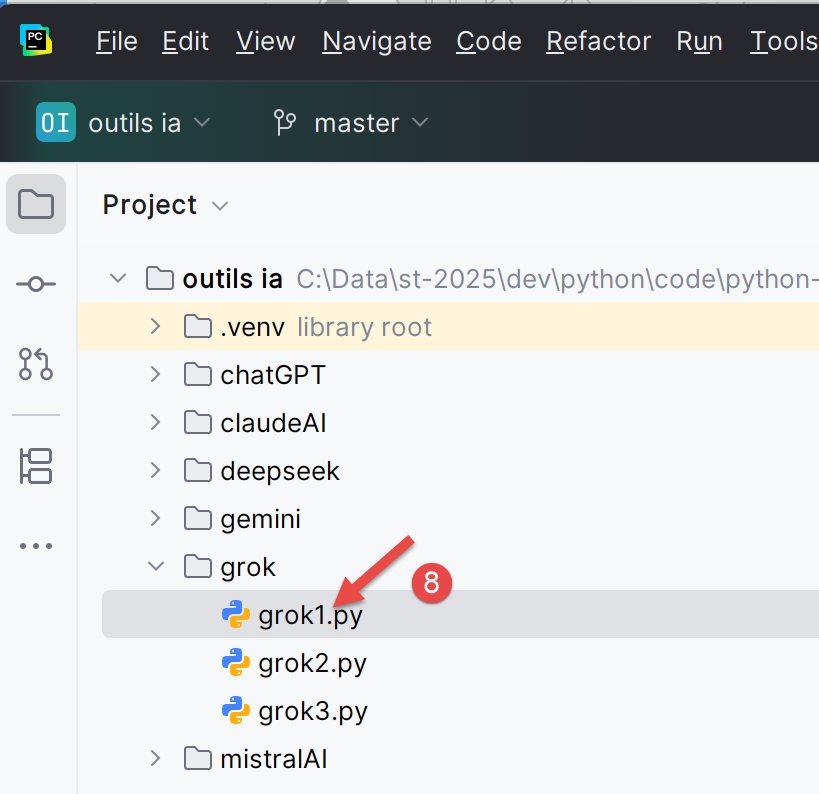 Para ejecutar los scripts de este documento, descargue el código en la URL |Generar un script de Python con herramientas de IA| (OneDrive) y, a continuación, en PyCharm, proceda de la siguiente manera: