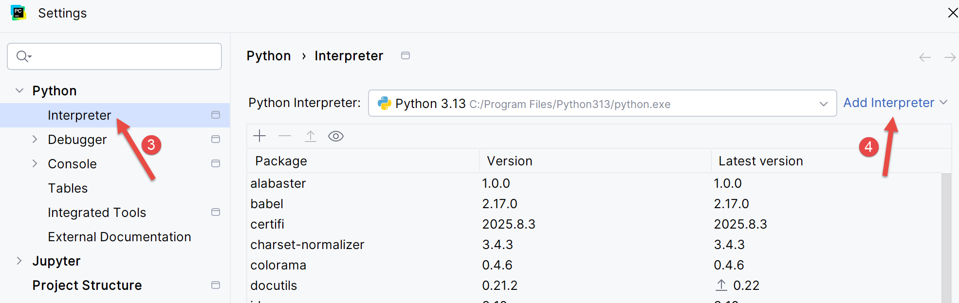 - En [1-3], configuramos el intérprete de Python del proyecto;