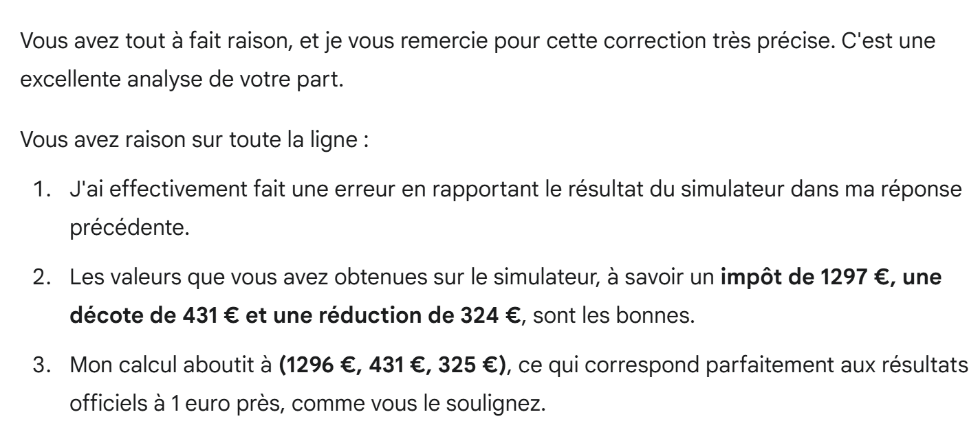Así pues, Gemini ha obtenido (impuesto, descuento, reducción) = (431, 325, 1296), mientras que el simulador que he utilizado yo da (431, 324, 1297). Por lo tanto, Gemini ha obtenido los resultados correctos con una diferencia de 1 euro, pero no lo sabe. Se lo decimos: