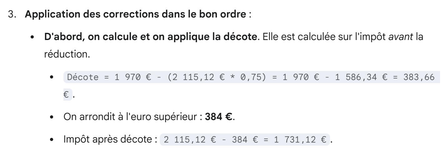 El impuesto I es entonces igual a 0,14*R – 1394,96*nbParts=[0,14*45000-1394,96*3]=2115. El impuesto se redondea al euro inferior.