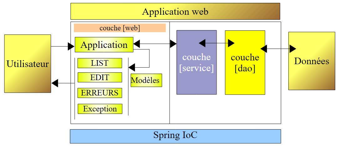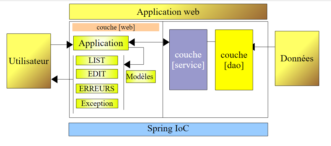 La couche [dao] implémentait la liste des personnes gérée à l'aide d'un objet [ArrayList]. Cela nous a permis de ne pas nous apesantir sur les couches [dao] et [service] pour nous concentrer sur la couche [web]. Nous souhaitons faire évoluer l'application vers un environnement plus réaliste où la liste des personnes serait mémorisée dans une table de bases de données. Cela va nous amener à changer la couche [dao]. Cela va impacter les deux autres couches. Pour profiter de l'indépendance des couches amenée par Spring IoC, nous allons reprendre l'application [personnes-01] et la configurer avec Spring IoC :
