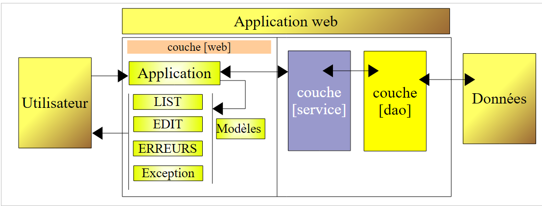 - La couche [service] va être également modifiée. Actuellement, son unique rôle est d’assurer un accès synchronisé aux données gérées par la couche [dao]. Dans ce but, nous avons synchronisé toutes les méthodes de la couche [service]. Nous avons expliqué pourquoi cette synchronisation était placée dans cette couche plutôt que dans la couche [dao]. Dans la nouvelle version, la couche [service] aura encore l’unique rôle de synchronisation des accès mais celle-ci sera assurée par des transactions de base de données plutôt que par une synchronisation de méthodes Java.
