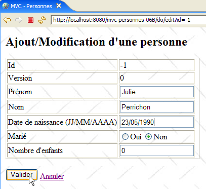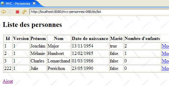 Tomcat est lancé à son tour. Avec un navigateur, nous demandons l’url [http://localhost:8080/mvc-personnes-06B] :