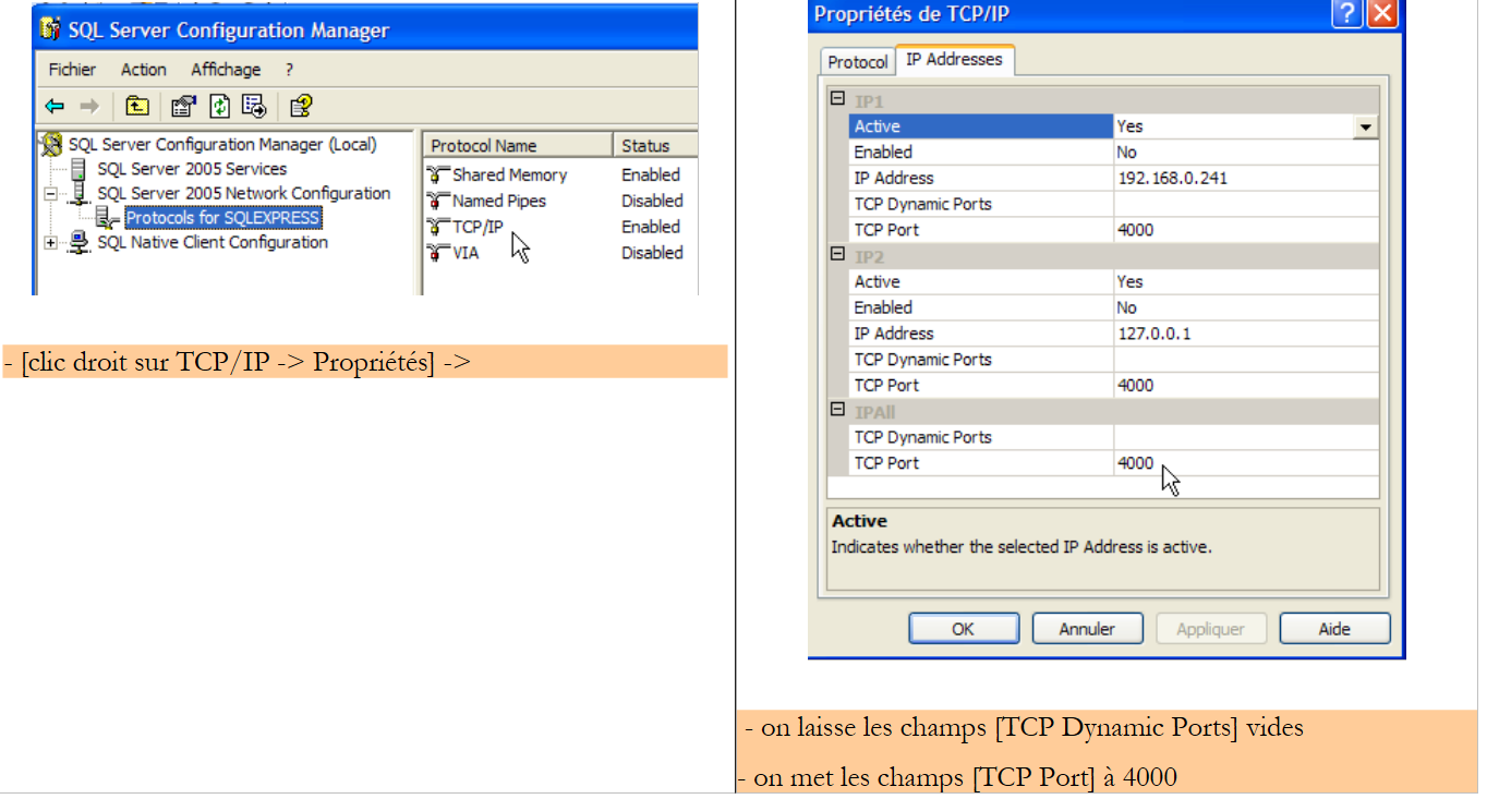 - 4000 : port d'écoute de SQL Express. Cela est dépendant de la configuration du serveur. Par défaut, il travaille avec des ports dynamiques, donc pas connus à l'avance. On ne précise alors pas de port dans l'url JDBC. Ici, nous avons travaillé avec un port fixe, le port 4000. Cela s'obtient par configuration :