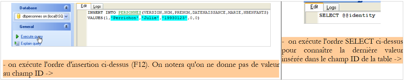 permet de connaître la dernière valeur insérée dans le champ ID de la table. Elle est à émettre après l'insertion. C'est une différence avec les SGBD [Firebird] et [Postgres] où on demandait la valeur de la clé primaire de la personne ajoutée avant l'insertion, mais c'est analogue à la génération de clé primaire du SGBD MySQL. Nous l’utiliserons dans le fichier [personnes-sqlexpress.xml] qui rassemble les ordres SQL émis sur la base de données.