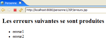 - ligne 8 : la page JSP commence par récupérer dans la requête [request] l'élément [erreurs] de son modèle. Cet élément représente un objet de type ArrayList d'éléments de type String. Ces éléments sont des messages d'erreurs. Dans le fonctionnement normal de l'application, ce sera le contrôleur [ServletPersonne] qui construira ce modèle.