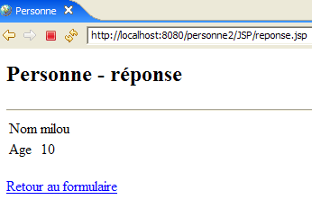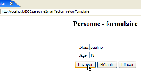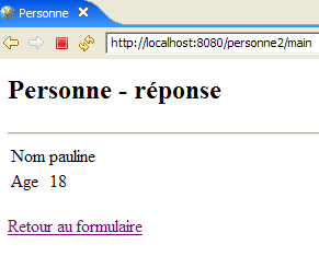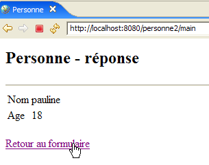 - la cible [href="?action=retourFormulaire"]. La vue [réponse] est affichée après le POST du formulaire [formulaire.jsp] à l'url [/personne2/main]. C'est donc cette dernière Url qui est affichée dans le navigateur lorsque la vue [réponse] est affichée. Un clic sur le lien [Retour au formulaire] va alors provoquer un Get du navigateur vers l'Url précisée par l'attribut [href] du lien, ici "?action=retourFormulaire". En l'absence d'Url dans [href], le navigateur va utiliser celle de la vue actuellement affichée, c.a.d. [/personne2/main]. Au final, le clic sur le lien [Retour au formulaire] va provoquer un Get du navigateur vers l'url [/personne2/main?action=retourFormulaire], c.a.d l'url du contrôleur de l'application accompagnée du paramètre [action] pour lui indiquer ce qu'il doit faire.