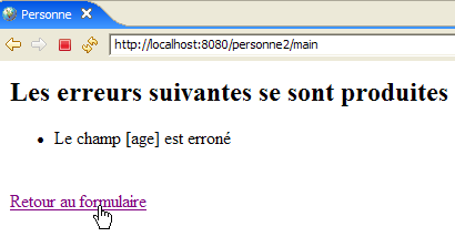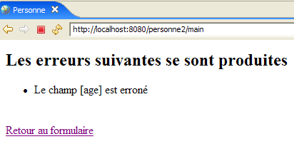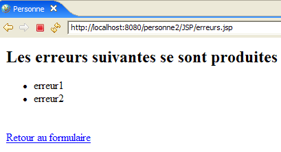 Vis à vis de la version précédente, la nouveauté vient du lien [Retour au formulaire]. La vue est générée par la page JSP [erreurs.jsp] suivante :