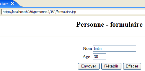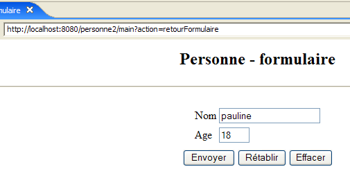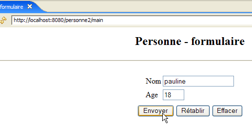 Lancer ou relancer Tomcat. Demander l'url [http://localhost:8080/personne2] puis reprendre les tests montrés en exemple au paragraphe 6.1.