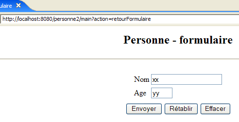 3 | [GET /personne2/main? action=retourFormulaire] | clic sur le lien [Retour au formulaire] des vues réponse] et [erreurs]. | - envoyer la vue [formulaire] pré-remplie avec les dernières valeurs saisies |