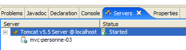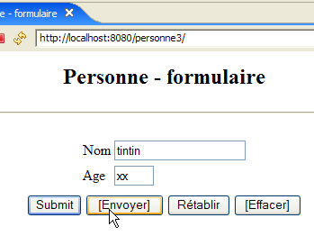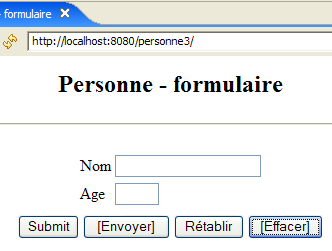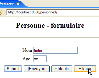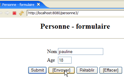 Lancer ou relancer Tomcat après y avoir intégré le projet Eclipse [personne-mvc-03]. Demander l'url [http://localhost:8080/personne3] puis reprendre les tests montrés en exemple au paragraphe 7.1.