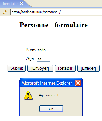 lignes 24-49 : la fonction Javascript [envoyer] vérifie la validité des valeurs des champs de saisie [txtNom, txtAge] avant de les poster. Elle utilise pour cela des expressions régulières.