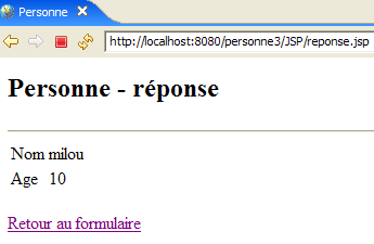 - lignes 35-37 : le lien [Retour au formulaire] embarque du Javascript. Un clic sur ce lien, provoque l'exécution du code Javascript de l'attribut [href]. Comme nous l'avons vu dans l'étude de [formulaire.jsp], nous savons que ce code poste les valeurs des champs de type <input>, <select>, ... du formulaire [frmPersonne].