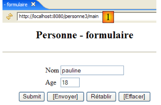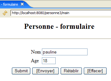 Ici, l'action ne fait plus partie de l'Url car elle va être envoyée par un POST au lieu d'un GET. Cette modification va avoir pour effet que l'unique Url affichée par le navigateur sera [http://localhost:8080/personne3/main] quelque soit l'action demandée.