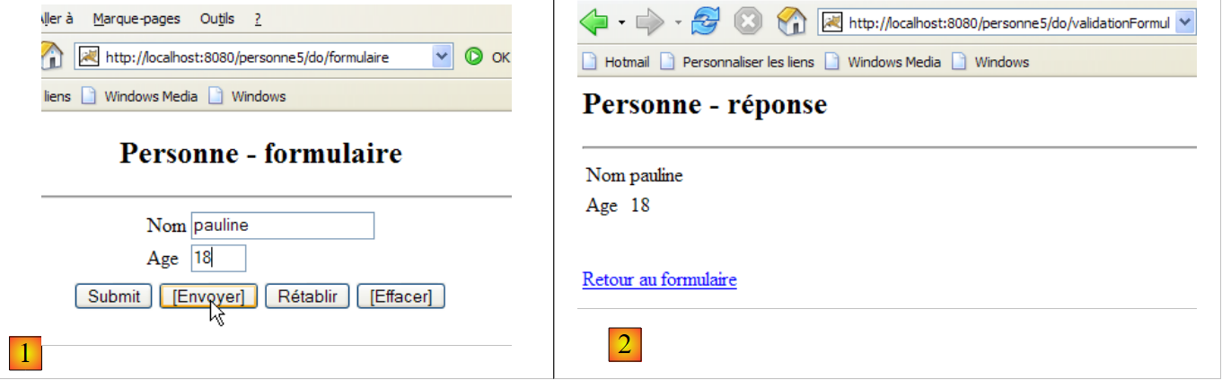 En [1], l'Url à laquelle a été postée le formulaire est [/personne5/do/validationFormulaire]. C'est le dernier élément [validationFormulaire] de l'Url qui a permis au contrôleur de reconnaître l'action à faire. En [2], le POST provoqué par le lien [Retour au formulaire] a été fait à l'Url [/personne5/do/retourFormulaire]. Là encore, le dernier élément [retourFormulaire] de l'Url indique au contrôleur l'action à faire.