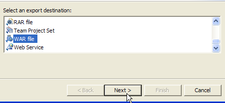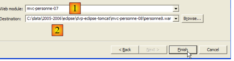 Choisissons dans la liste déroulante [1] le nom du module à exporter, ici [mvc-personne-07] et avec le bouton [Browse] indiquons le fichier .war à produire, ici [personne8.war]. Terminons le processus avec le bouton [Finish] et avec l'explorateur windows allons voir le fichier qui a été produit :