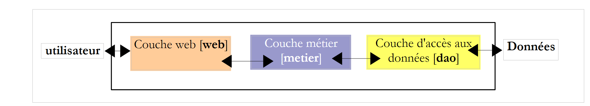 - la couche [dao] s'occupe de l'accès aux données, le plus souvent des données persistantes au sein d'un SGBD. Mais cela peut être aussi des données qui proviennent de capteurs, du réseau, ...