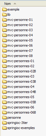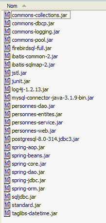 Le dossier [lib] rassemble les archives utilisées par les différents projets étudiés. Les dossiers [lib] des différents projets ont été eux vidés afin de diminuer la taille du zip. Il faudra donc aller chercher les archives nécessaires à un projet, dans le dossier [lib] ci-dessus. Dans les dossiers [lib] des projets web [mvc-personnes-0XB], ont été laissées les archives des couches [dao], [service] et [web] de l'application construite par les projets associés [mvc-personnes-0X] :