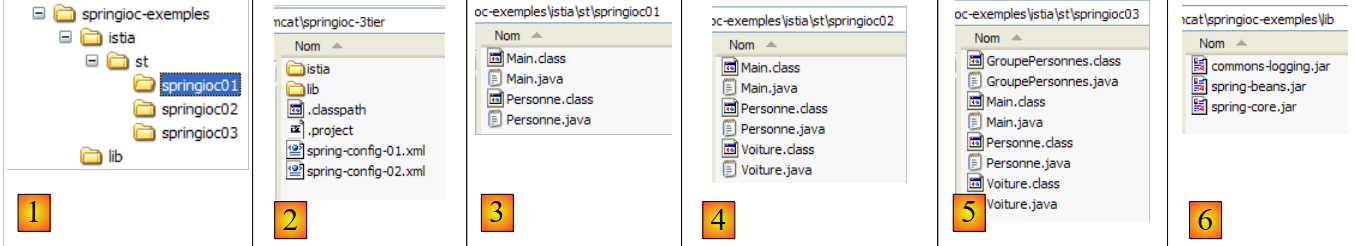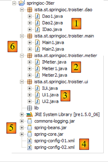 - [6] : le paquetage des tests. [Main1] utilisera la configuration [spring-config-01.xml] et [Main2] la configuration [spring-config-02.xml].