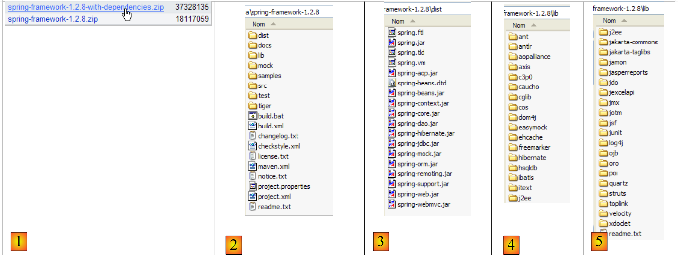 - [3] : la distribution [Spring], c.a.d. les archives .jar du projet Spring lui-même sans ses dépendances. L'aspect [IoC] de Spring est assuré par les archives [spring-core.jar, spring-beans.jar].