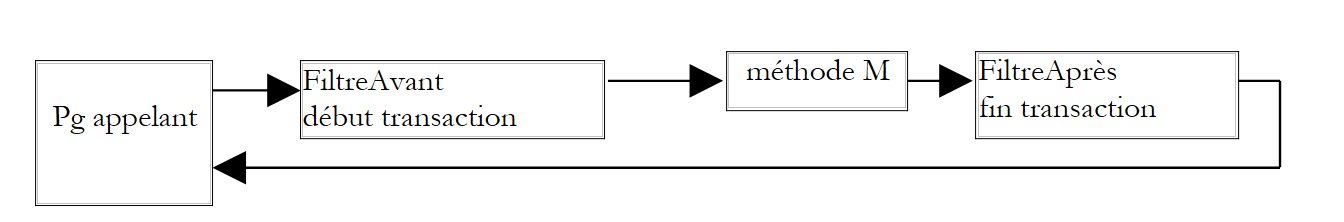 La solution du filtrage AOP est plus souple. Elle va permettre de définir un filtre qui, avant l'appel de M va commencer une transaction et après l'appel va opérer un commit ou rollback selon les cas.