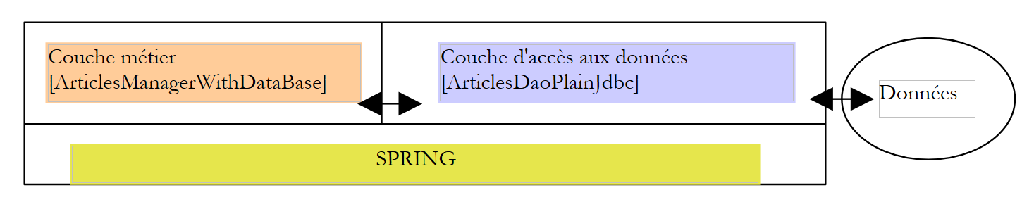 La solution avec Spring va éliminer le besoin qu'a la classe métier [ArticlesManagerWithDataBase] de connaître le nom [ArticlesDaoPlainJdbc] de la classe d'accès aux données dont elle a besoin. Cela permettra d'en changer sans toucher au code java de la classe métier. Spring va permettre de créer en même temps les deux singletons, celui de la couche d'accès aux données et celui de la couche métier. Le fichier de configuration de Spring va définir un nouveau bean :
