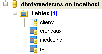 - les lignes 27-29 modélisent la relation "plusieurs à un" qui existe entre la table [rv] et la table [clients] (un client peut apparaître dans plusieurs Rv) de la base de données et les lignes 23-25 la relation "plusieurs à un" qui existe entre la table [rv] et la table [creneaux] (un créneau peut apparaître dans plusieurs Rv).