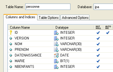 - la table T existe déjà : les annotations JPA doivent alors reproduire l'existant (nom et définition des colonnes, contraintes d'intégrité, clés étrangères, clés primaires, ...)