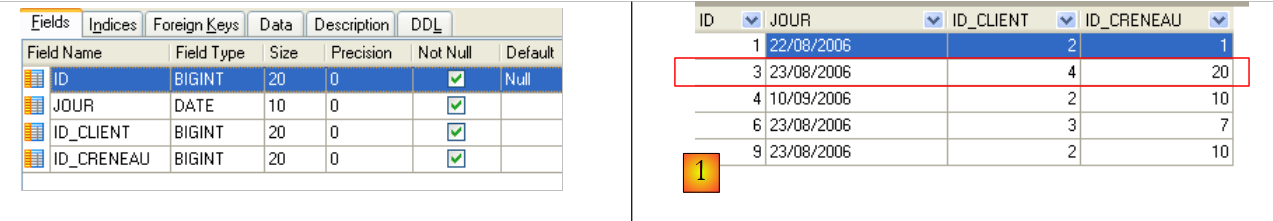le champ clé primaire est défini comme ayant le type Identity. On a un résultat similaire au générateur de valeurs de Firebird, si ce n'est que la valeur de la clé n'est connue qu'après l'insertion de la ligne. | |