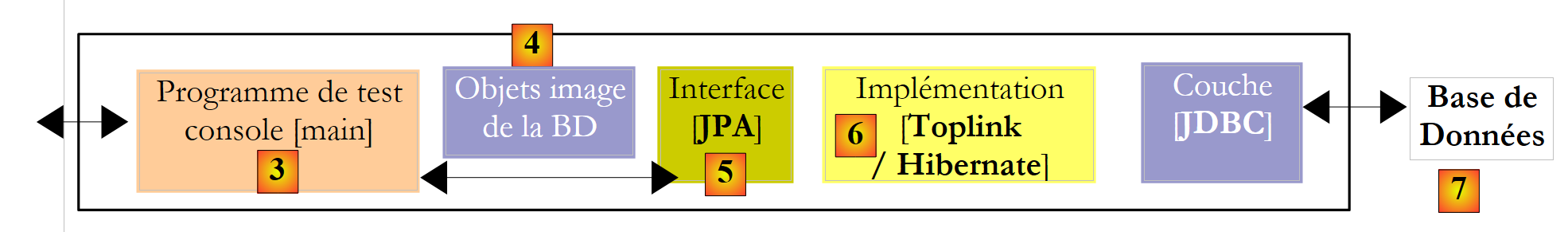 La couche JPA [5] doit faire un pont entre le monde relationnel de la base de données [7] et le monde objet [4] manipulé par les programmes Java [3]. Ce pont est fait par configuration et il y a deux façons de le faire :