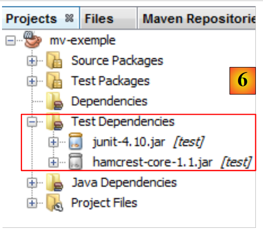 On notera que fichier [pom.xml] ne mentionne pas la dépendance [hamcrest-core-1.1] que nous voyons en [6]. Cela parce que c'est une dépendance de JUnit 4.10 et non du projet lui-même. Cela est signalé par une icône différente dans la branche [Dependencies]. Elle a été téléchargée automatiquement.