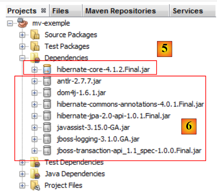 - en [5], la dépendance [hibernate-core-4.1.2-Final]. Dans le dépôt où il a été trouvé, cet [artifactId] est lui aussi décrit par un fichier [pom.xml]. Ce fichier a été lu et Maven a découvert que l'[artifactId] avait des dépendances. Il les télécharge également. Il fera cela pour chaque [artifactId] téléchargé. Au final, on trouve en [6] des dépendances qu'on n'avait pas demandées directement. Elles sont signalées par une icône différente de celle de l'[artifactId] principal.