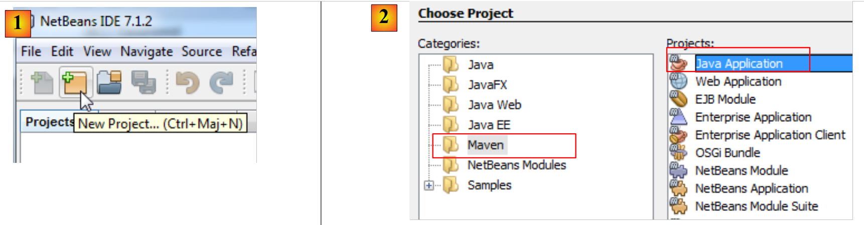 - en [2], choisir la catégorie [Maven] et le type de projet [Java Application],
