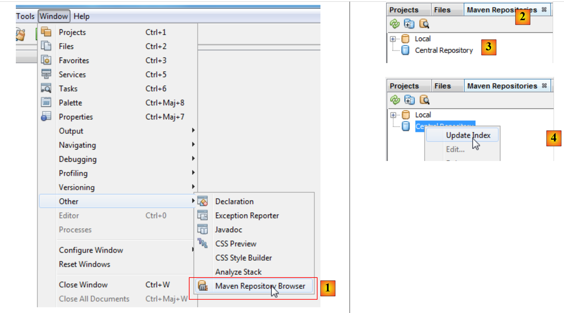 - en [1], on choisit l'option [Window / Other / Maven Repository Browser],