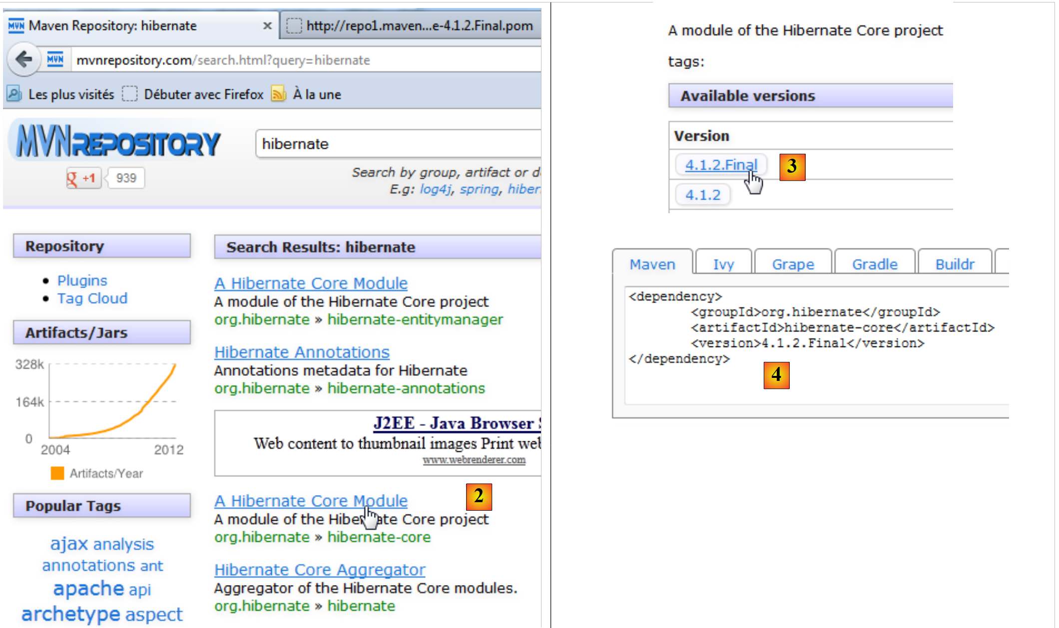 - en [2], choisissons le [groupId] org.hibernate et l'[artifactId] hibernate-core,