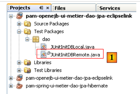 En [1], la classe [JUnitInitDBLocal] a été dupliquée (copy / paste) dans [JUnitInitDBRemote]. Dans cette classe, nous remplaçons les interfaces locales par les interfaces distantes :