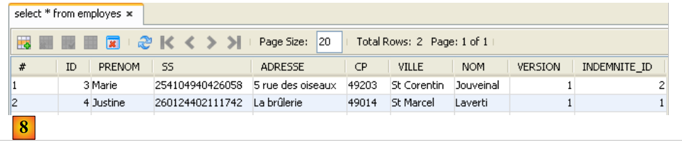- en [7], on voit les 4 tables créées par la couche JPA. Le test avait pour but de les remplir. On visualise le contenu de l'une d'entre-elles