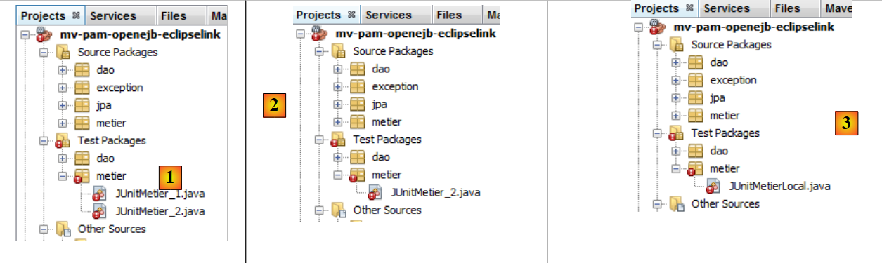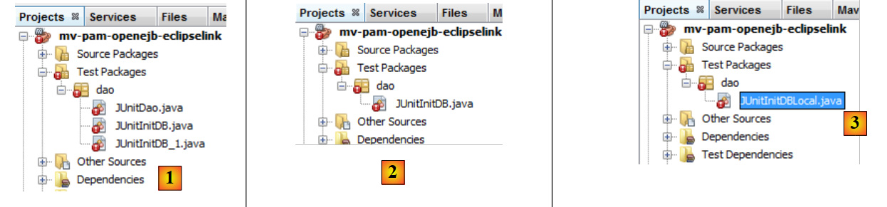 Nous ne conservons que le test [JUnitInitDB] qui initialise la base avec quelques données [2]. Nous renommons la classe [ JUnitInitDbLocal] [3]. La classe [JUnitInitDBLocal] utilisera l'interface locale des EJB de la couche [DAO].