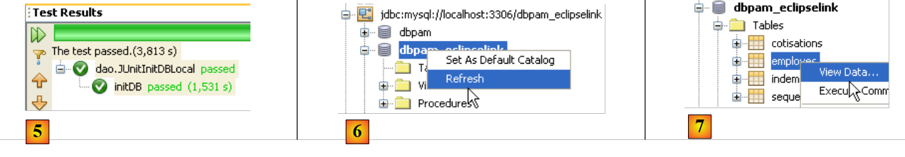 On construit le projet (Build), on lance le serveur MySQL si besoin est, on exécute le test JUnitInitDBLocal. On rappelle que le fichier [persistence.xml] a été configuré pour recréer les tables à chaque exécution. Avant l'exécution du test, il est préférable de supprimer les éventuelles tables de la base MySQL [dbpam_eclipselink].