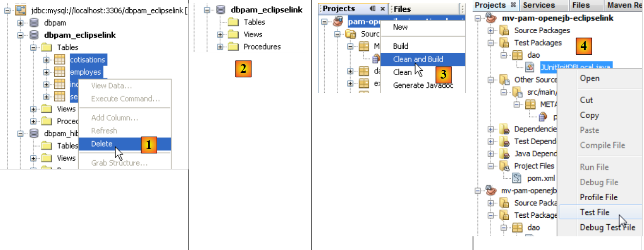 Ceci fait, la nouvelle classe de test peut être exécutée. Auparavant, avec la connexion Netbeans [dbpam_eclipselink], supprimez les tables de la base [dbpam_eclipselink].