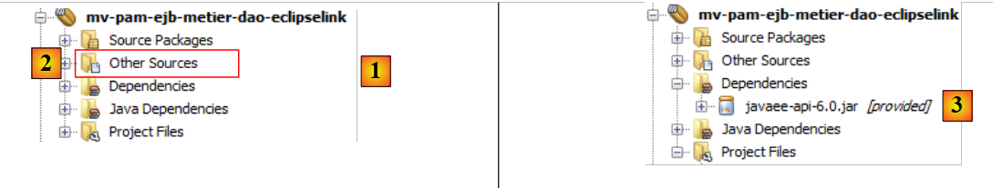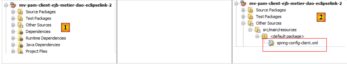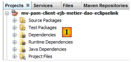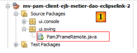 - en [1], le résultat de la copie des paquetages [jpa, dao, metier, exception] du projet [mv-pam-openejb-eclipselink] dans le module EJB [mv-pam-ejb-metier-dao-jpa-eclipselink]