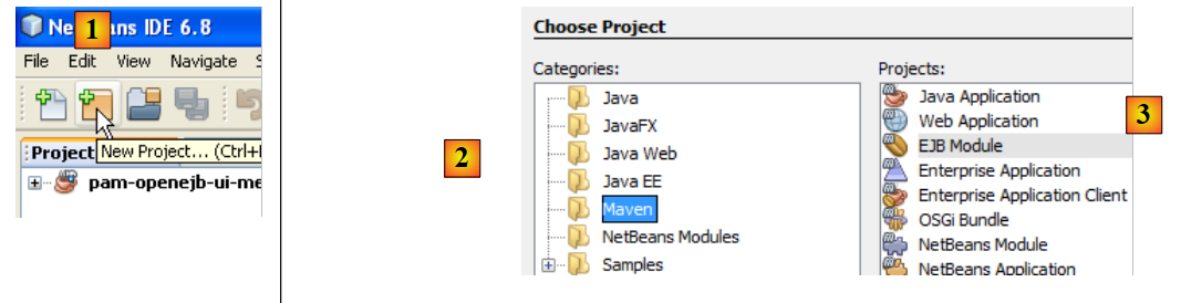 - en [2], choisir la catégorie Maven et en [3] le type EJB Module. Il s'agit en effet de construire un projet qui sera hébergé et exécuté par un conteneur EJB, celui du serveur Glassfish.
