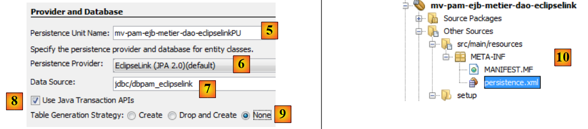 - en [9], indiquer qu'aucune opération ne doit être faite sur la source de données lors du déploiement du module EJB sur le serveur. En effet, le module EJB va utiliser une base [dbpam_eclipselink] déjà créée.