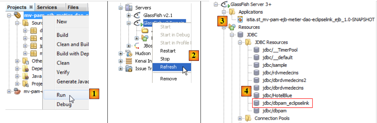 - en [3], après déploiement, le module EJB apparaît dans la branche [Applications] du serveur Glassfish