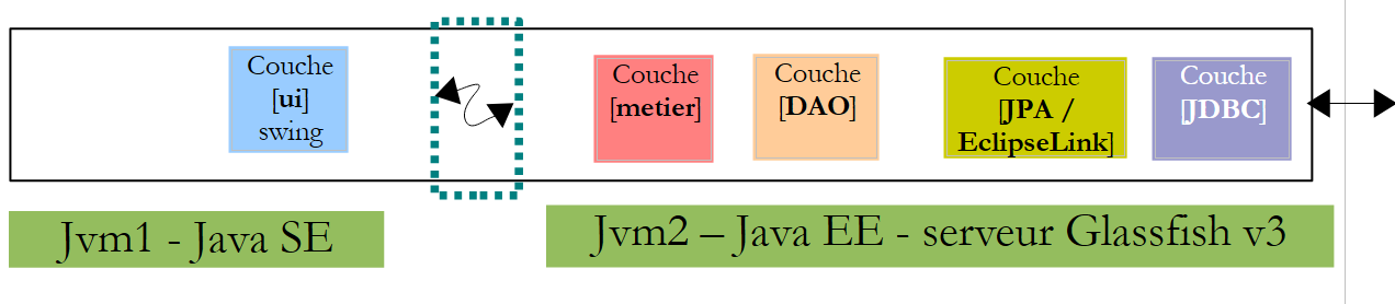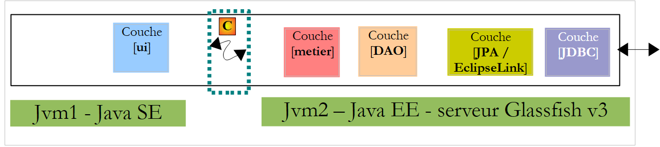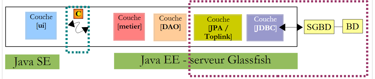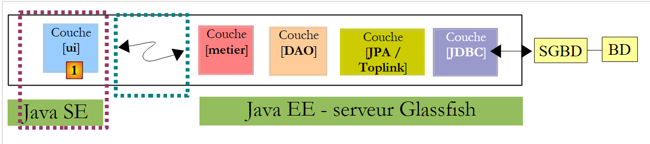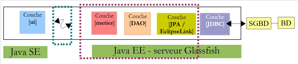 - les couches [metier, DAO, JPA] s'exécuteront dans un environnement Java EE (Enterprise Edition) sur un serveur Glassfish v3