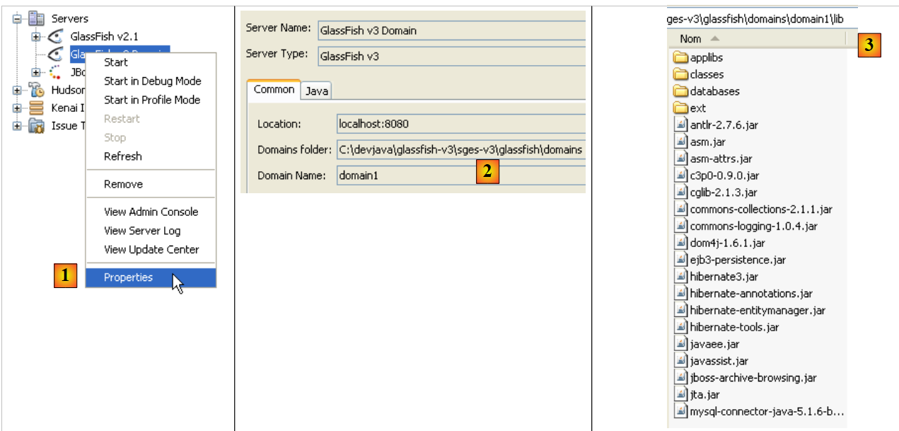 - dans le dossier <domains>\domain1\lib, mettre les bibliothèques manquantes. Dans l'exemple, les bibliothèques d'Hibernate (lib / hibernate-tools) et le pilote JDBC de MySQL (lib / divers) ont été rajoutés. Par défaut, le serveur Glassfish a les bibliothèques d'EclipseLink. On ne rajoutera donc que le pilote JDBC de MySQL.