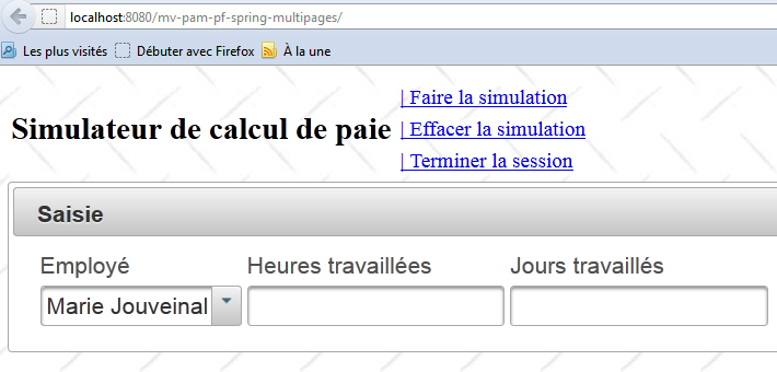 La page d'accueil utilise les composants <p:panel>, <p:inputText>, <p:selectOneMenu>, <p:message> :