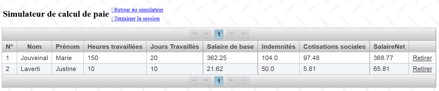 La liste des simulations utilise les composants <p:dataTable>, <p:commandLink> :