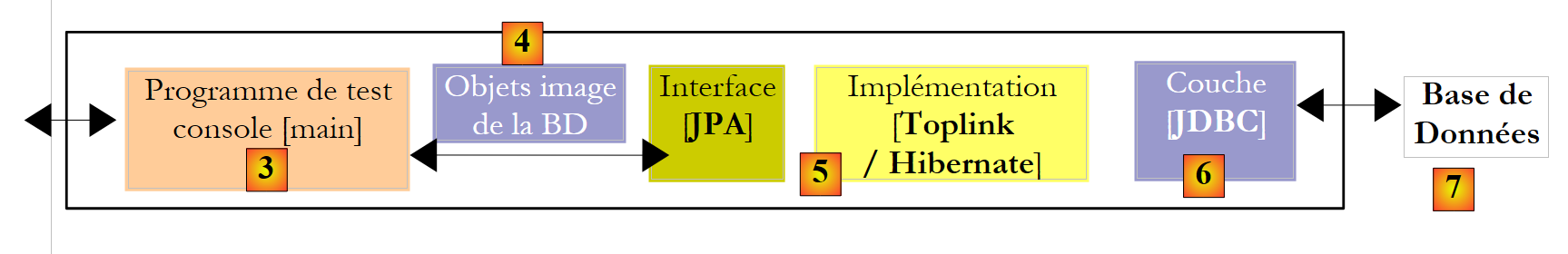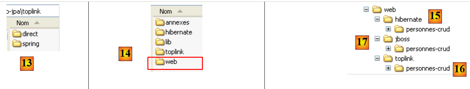 - en [13] : le dossier <toplink> reprend les exemples du dossier <hibernate> [9] mais avec cette fois une couche de persistance JPA/Toplink au lieu de JPA/Hibernate. Il n'y a pas dans [13] de dossier <jbossejb3> car il n'a pas été possible de faire fonctionner un exemple où la couche de persistance est assurée par Toplink et les services assurés par le conteneur EJB3 de JBoss.