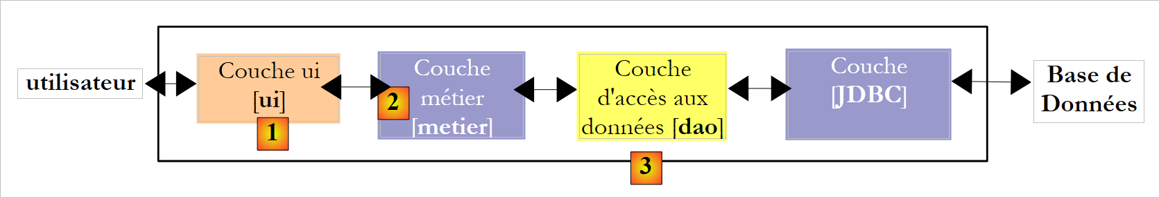 - la couche [1], appelée ici [ui] (User Interface) est la couche qui dialogue avec l'utilisateur, via une interface graphique Swing, une interface console ou une interface web. Elle a pour rôle de fournir des données provenant de l'utilisateur à la couche [2] ou bien de présenter à l'utilisateur des données fournies par la couche [2].